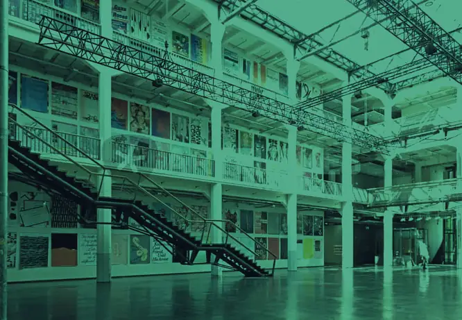 “The first six to eight years of our existence were entirely improvised and essayistic,” Peter Sloterdijk reflected in 2008. This also applied to physical accommodations. Only when the university and ZKM moved into the vast halls of the former weapons and munitions factory (Industrie-Werke Karlsruhe AG) did Heinrich Klotz’s vision, which he vividly described to me as we walked through the derelict ruins of the industrial complex, come to fruition: under one roof, guided by a single “conductor” (whose office was envisioned under the building’s roof), the interplay of art, media, and thought would be taught, researched, experimentally tested, and exhibited.